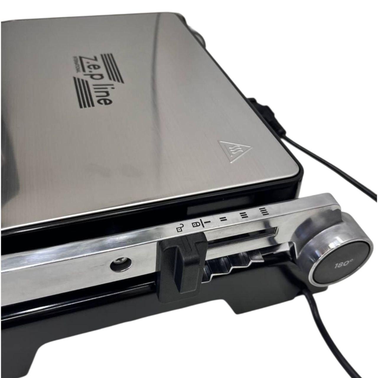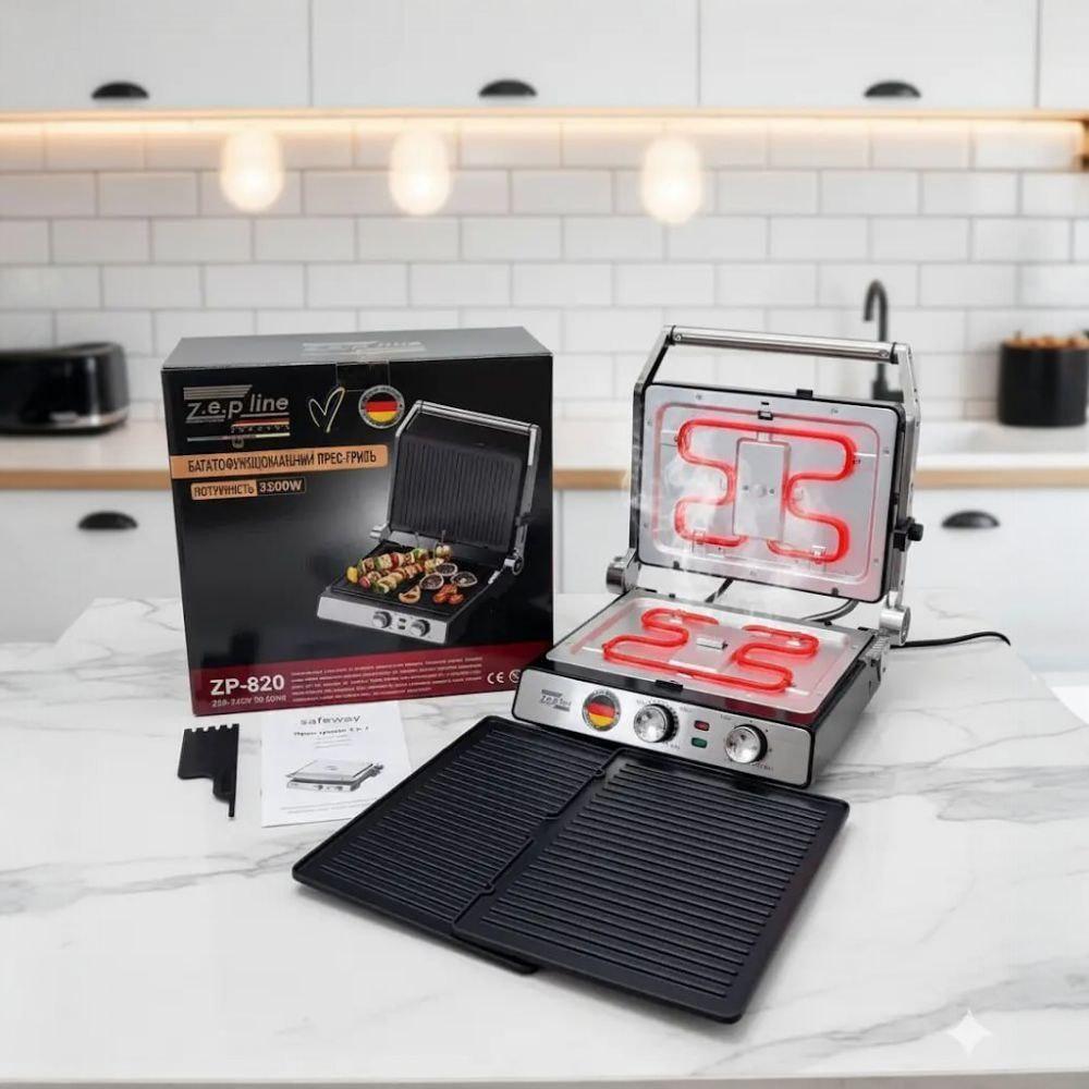 Електрогриль Zepline ZP-820 — універсальний прилад для приготування смачних і корисних страв у домашніх умовах. Завдяки потужності 3500 Вт гриль миттєво нагрівається та забезпечує рівномірне обсмаження продуктів з обох боків. Ідеально підходить для приготування м’яса, овочів, риби, бутербродів чи паніні.