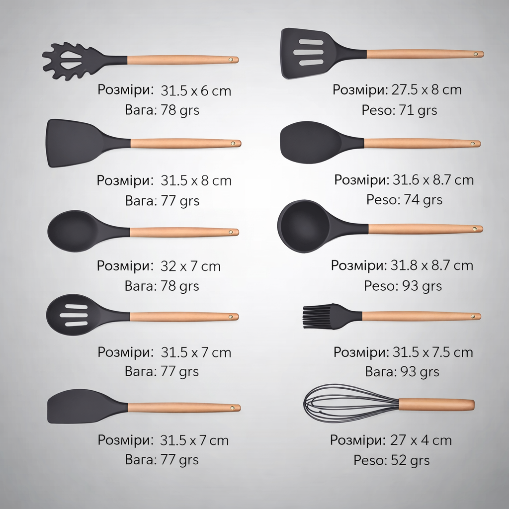 Робочі частини виготовлені з термостійкого силікону, що не пошкоджує антипригарне покриття посуду та витримує високі температури. Ергономічні ручки з дерева забезпечують зручність у використанні та надають приладам елегантного вигляду.